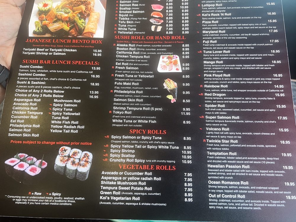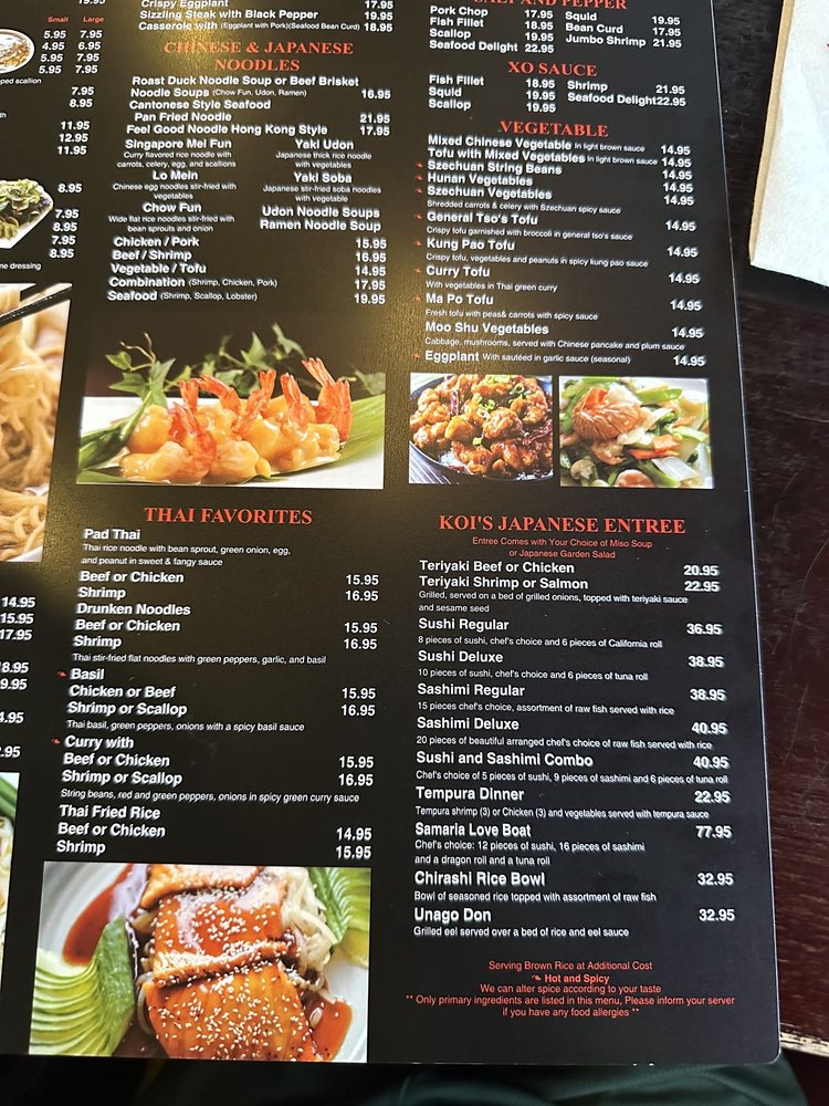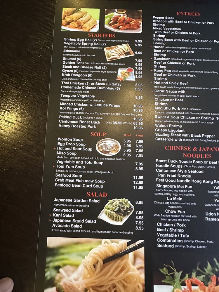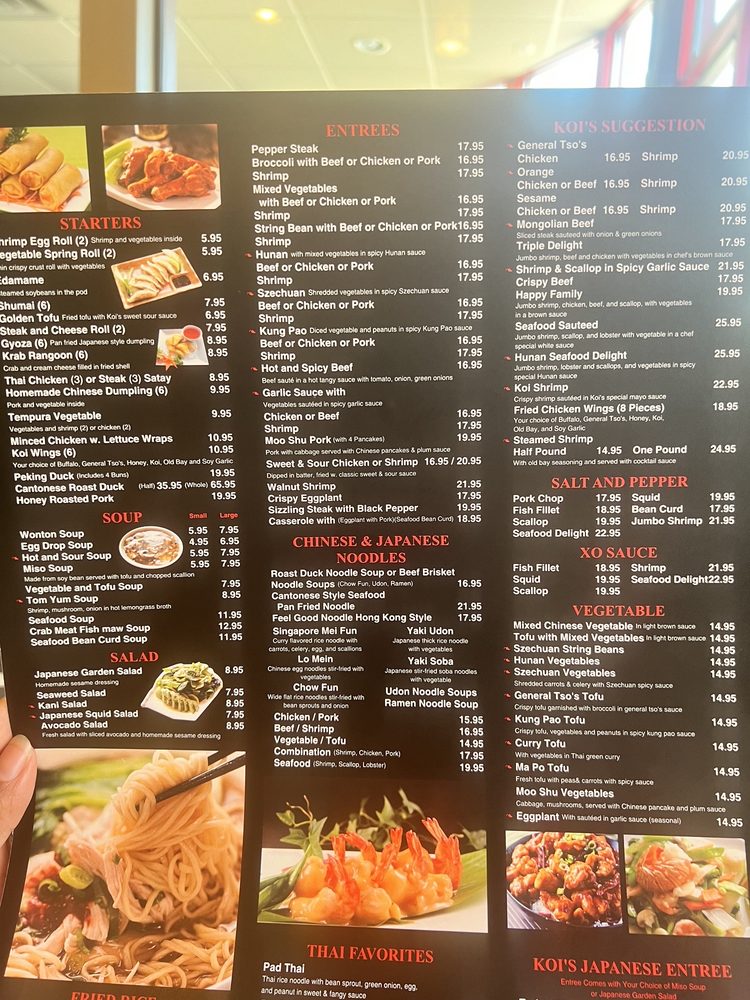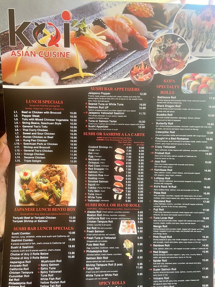 Koi Asian Cuisine offers a diverse menu featuring Thai, Chinese, and Japanese cuisine. Located in Silver Spring, MD, this restaurant provides a casual atmosphere with options for both vegetarians and non-vegetarians. With a sushi bar serving up innovative dishes like Jalapeno Popper and Seared Tuna, as well as a variety of sushi and sashimi options, there is something for everyone to enjoy. Customer reviews mention standout dishes like Mongolian Beef and Thai curry chicken, highlighting the range of flavors available. While some may have mixed experiences with service, the overall dining experience at Koi Asian Cuisine seems to be positive. With options for happy hour specials, outdoor seating, and catering services, this restaurant caters to a wide range of preferences and occasions.